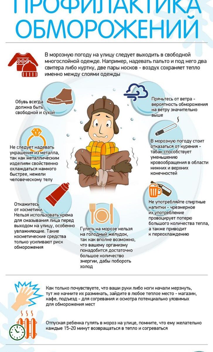 Как правило, ниже −8 градусов. Но! Обморожение может наступить не столько из-за низкой температуры, сколько из-за сильного ветра, мокрой и тесной одежды и обуви. Иногда даже при плюсовой температуре ребенок может отморозить пальцы, например. Дети заигрываются, потеют. Шапка сползает, варежки, обувь и одежда промокают — это и способствует охлаждению. Чаще всего страдают щеки, уши, пальцы рук и ног.