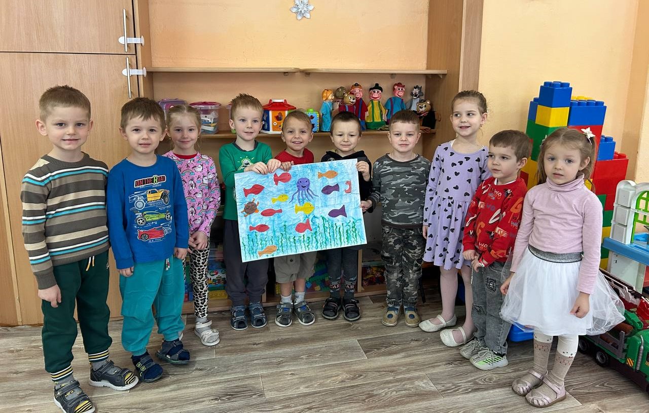 В средней группе прошло занятие по образовательной области “Изобразительное искусство”. Коллективная работа аппликация с элементами рисования “Водный мир”.