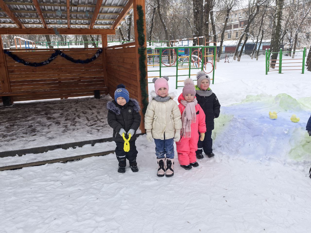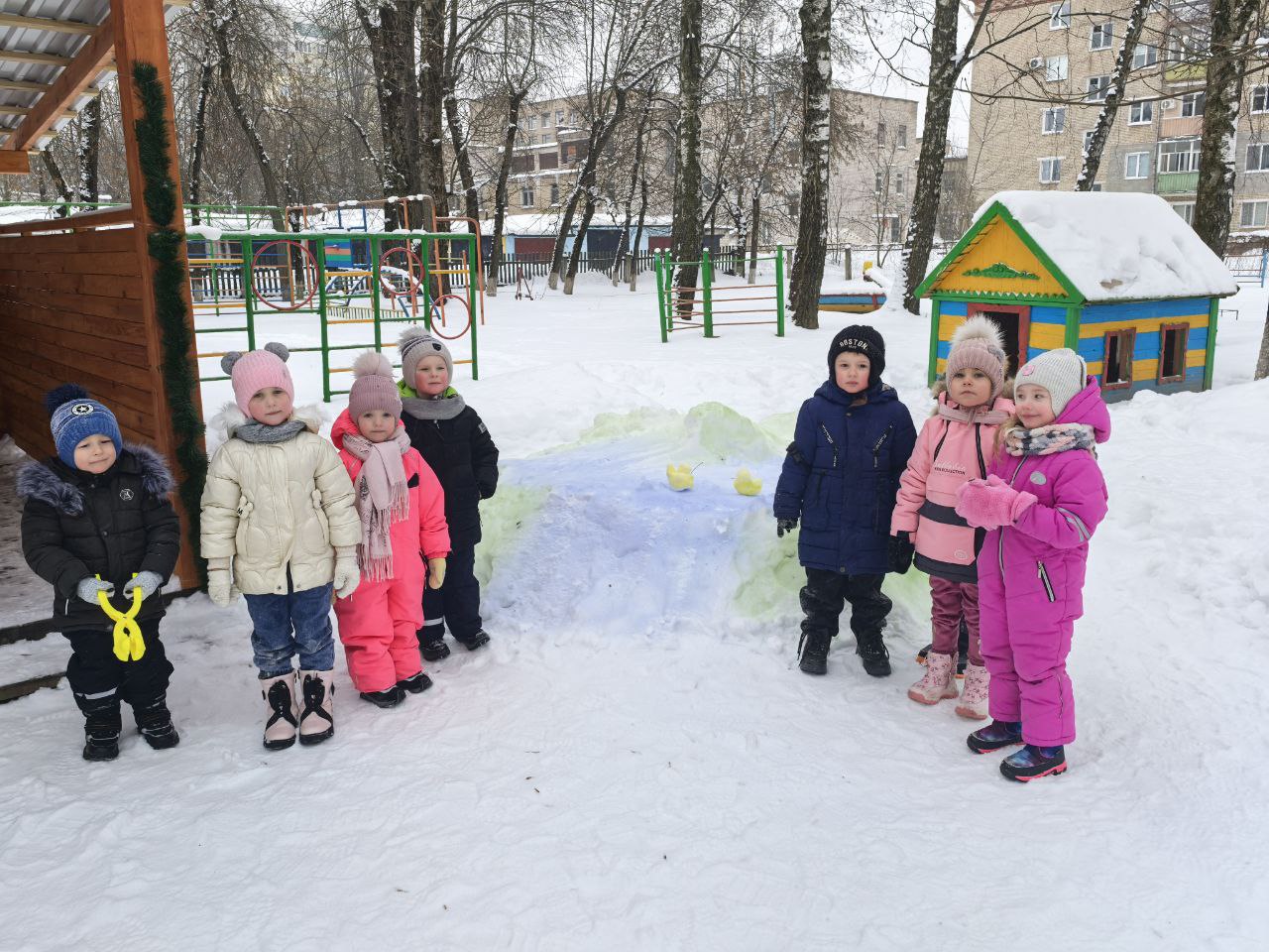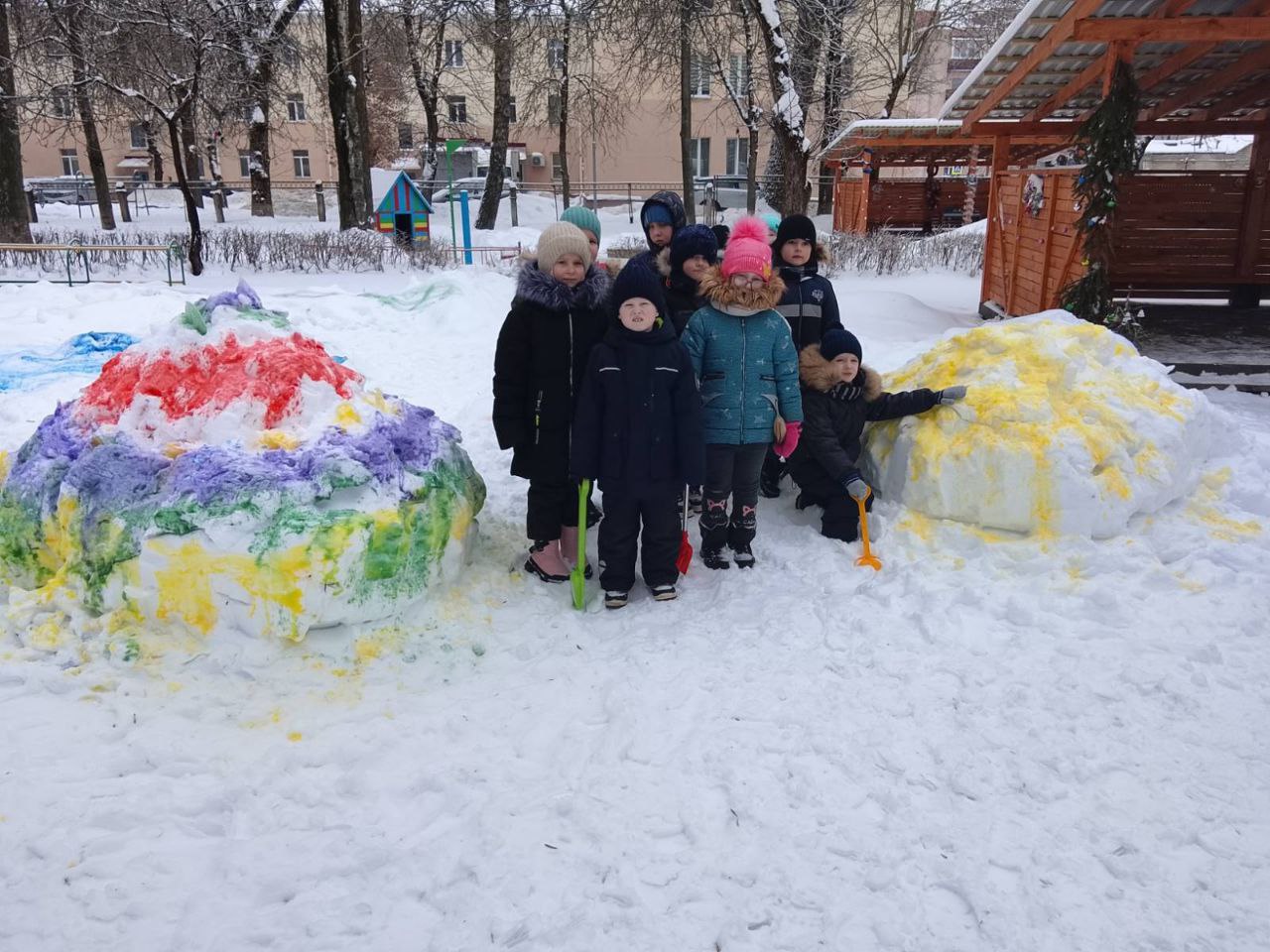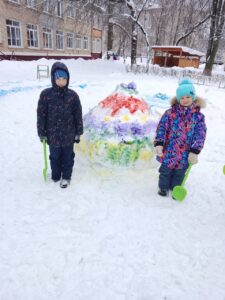 Дети учатся взаимодействовать с природой и приспосабливаться к условиям зимы. Ведь только зимой можно использовать в играх такой замечательный строительный материал, как снег. После снегопада взрослые сгребают на участках снег и рыхлят его, чтобы ребятам было легко его копать. Для строительства пригодится специальный инвентарь: лопаты, снеголепы.
